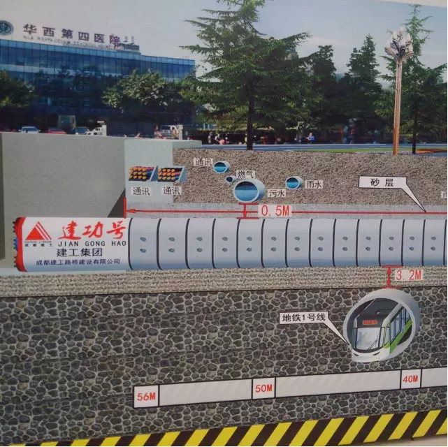 四川大学华西校区下穿人民南路人行通道,全长56米,施工段位于地下约9米处,上跨为正在运营的地铁1号线,距地铁隧道顶板仅3.1米;与地面之间还有约15条各类市政管线,距**近的一条管线仅0.5米。地理位置决定了该通道必须在地铁和众多市政管线的夹缝中修建,必须实现“三保”:即上保路面交通不中断,中保各类市政管线不渗漏,下保地铁1号线运营不停止,施工难度非常大,工期要求非常紧。